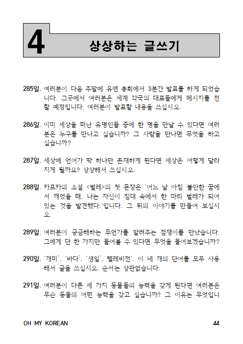 This book has writing prompts to practice Korean writing 365 days a year. And all the prompts are divided into persuasive writing ', explanatory writing', 'narrative writing ', and 'imaginative writing'.